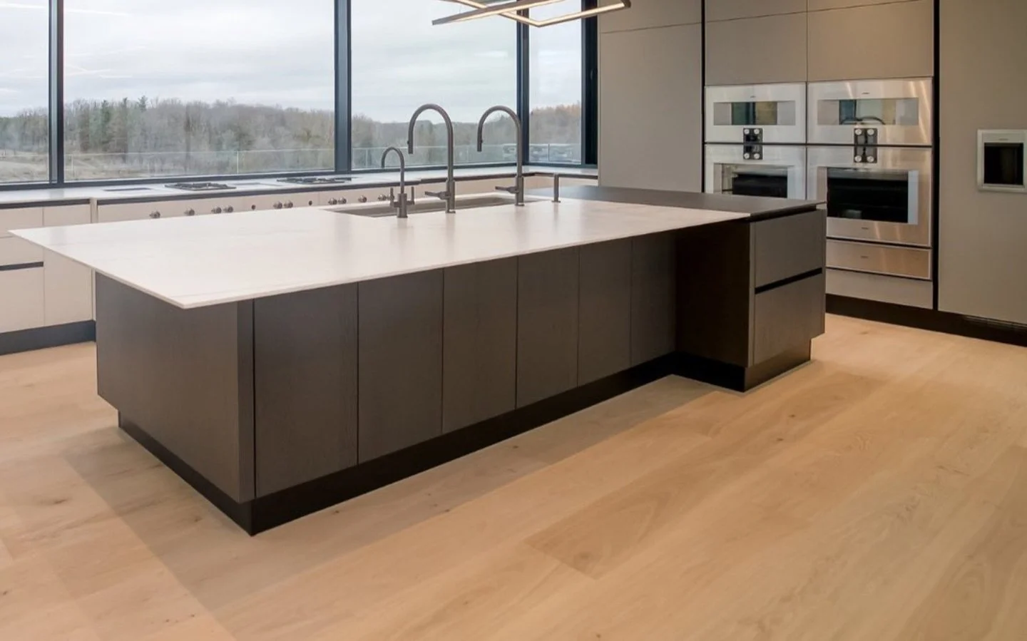 Set against a serene lakeside backdrop, this home features wide-plank hardwood floors—glue-down installation throughout an expansive layout that seems to flow endlessly from room to room. The continuous boards create a seamless visual rhythm, reinforcing the calm, open feel of the space.