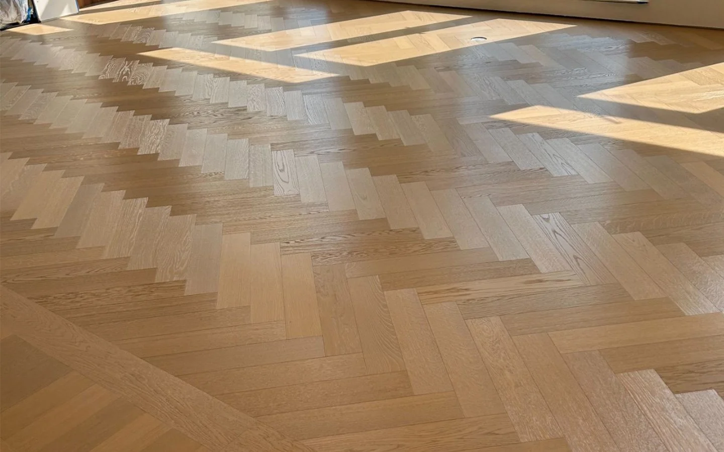 This 5,000 sq ft penthouse features European white oak flooring, finished with Rubio Monocoat to highlight its natural beauty and ensure long-lasting durability. The design is anchored by a predominantly herringbone pattern, enhanced with custom borders, standing soldier thresholds, and detailed inlays—each element demanding exacting precision and patience.